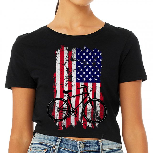 American Flag Bicycle Women’s Cropped T-Shirt – Patriotic Crop Top – Retro Design Cropped Tee