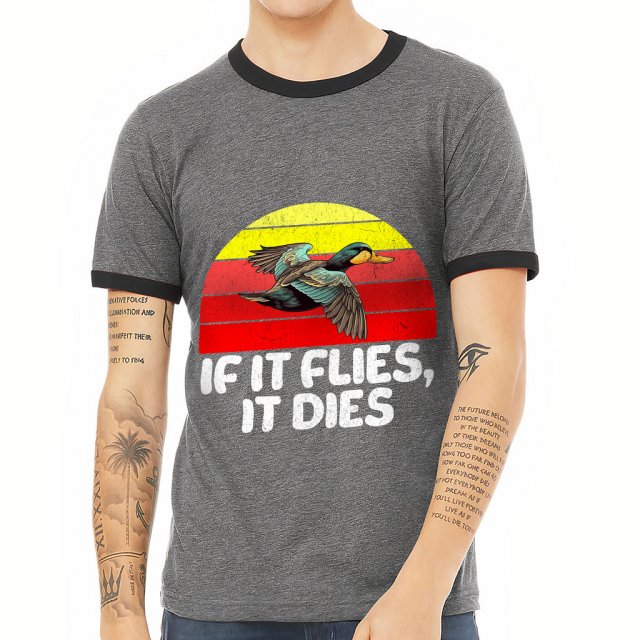 If It Flies It Dies Ringer T-Shirt – Duck Print T-Shirt – Hunting Themed Ringer Tee